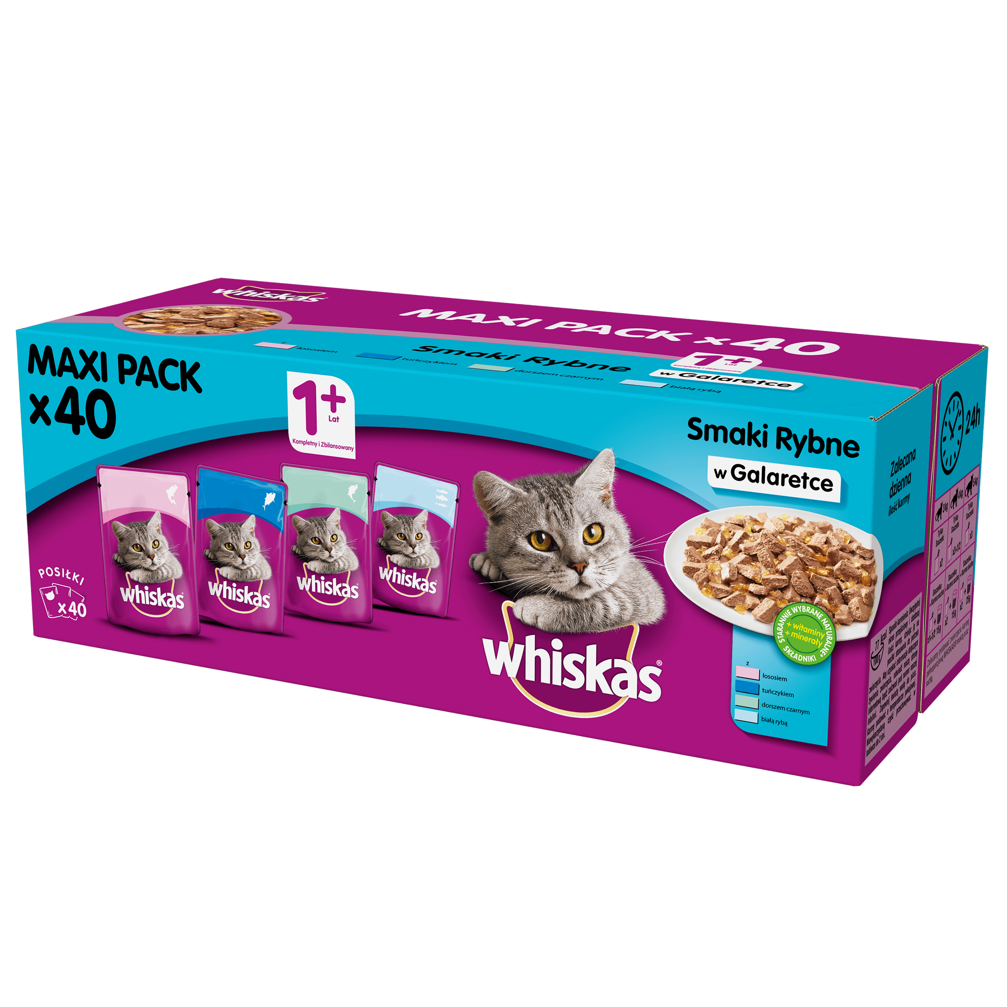 WHISKAS Adult saszetka 40 x 100 g Smaki Rybne - mokra karma dla kotów, w galaretce (kawałki z łososiem, kawałki z tuńczykiem, kawałki z dorszem czarnym, kawałki z białą rybą)