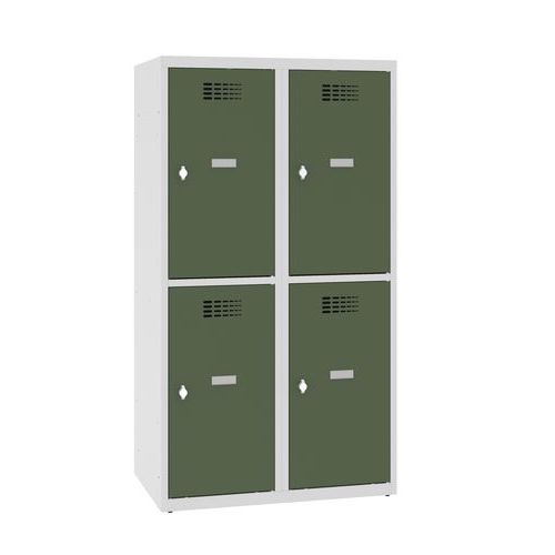 Niższe szafki szatniowe szkolne, 4 przedziały, 400 mm, zamek cylindryczny - Niższa szafka szatniowa szkolna, 4 przedziały, 400 mm, szara/zielona, zame