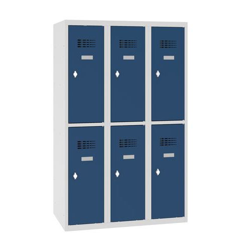 Niższe szafki szatniowe szkolne, 6 przedziałów, 300 mm, zamek obrotowy - Niższa szafka szatniowa szkolna, 6 przedziałów, 300 mm, szara/niebieska, zame