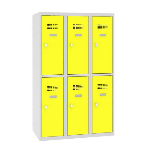 Niższe szafki szatniowe szkolne, 6 przedziałów, 300 mm, zamek obrotowy - Niższa szafka szatniowa szkolna, 6 przedziałów, 300 mm, szara/żółta, zamek ob