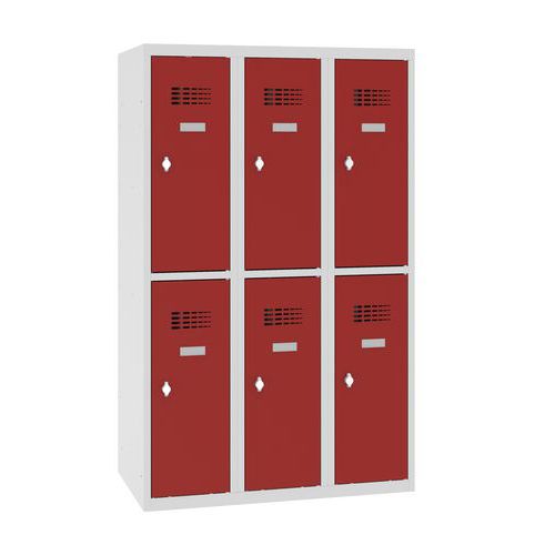 Niższe szafki szatniowe szkolne, 6 przedziałów, 300 mm, zamek obrotowy - Niższa szafka szatniowa szkolna, 6 przedziałów, 300 mm, szara/czerwona, zamek